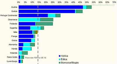 À frente de Portugal ficam apenas a Áustria e a Suécia, no que respeita à produção de energia eléctrica a partir de fontes renováveis. A energia hídrica é a que assume maior expressão, seguida da eólica.